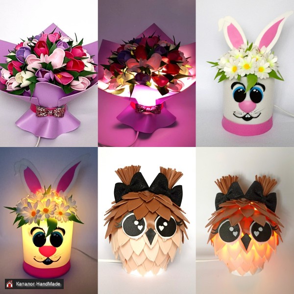 Если вы ищете идеальный подарок для себя или для своих близких, то я готова предложить Вам настольные светильники в виде букета, шляпной коробки, замка, мячика, совёнка, зайчика и других фигур! У меня есть огромный выбор дизайнов, и Вы сможете заказать любой настольный светильник, который будет соответствовать вашим желаниям и предпочтениям.