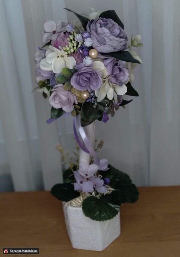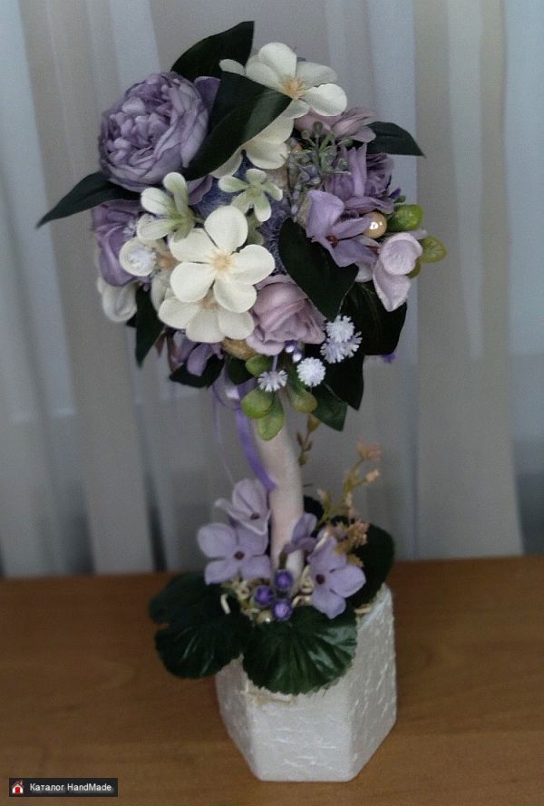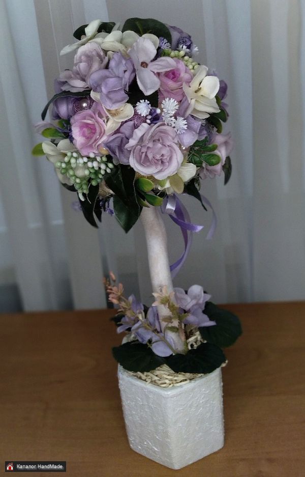 Высота 43 см. ширина кроны 19 см. Используемые материалы: декоративные цветы из ткани, искусственная зелень, сизаль, бусины, декор, атласные ленты, деревянный стволик, керамический горшок, акриловая краска, лак.
