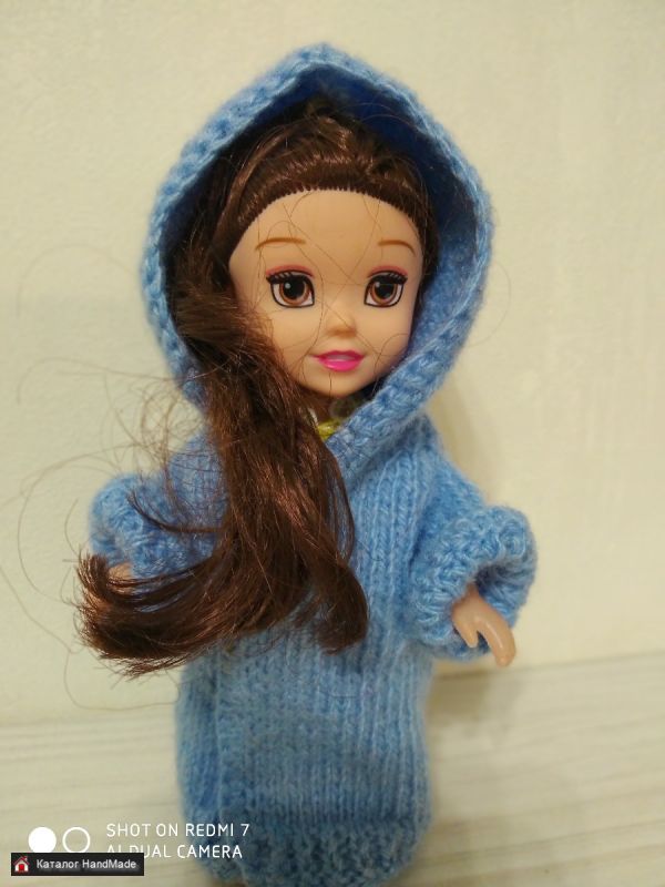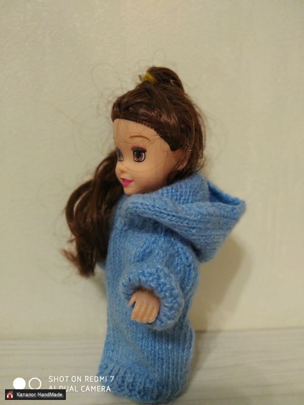 Пальто для куклы вязанное голубое
