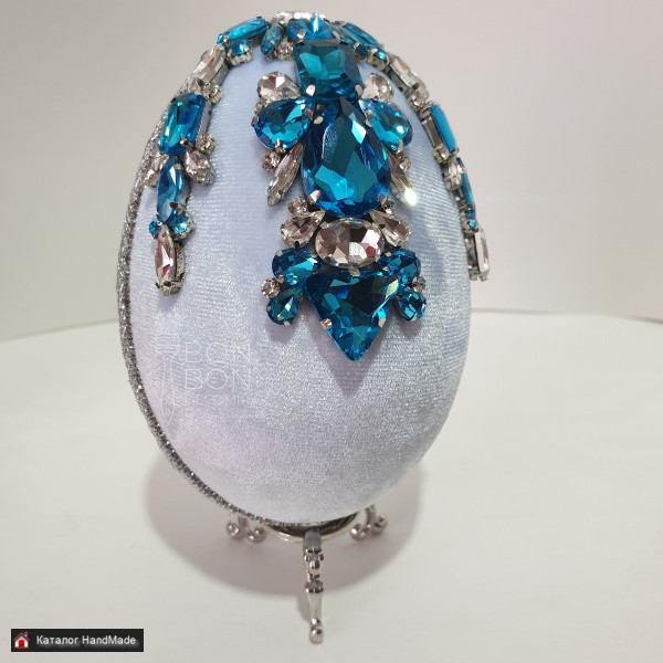 Диаметр Пасхального яйца - 12см., высота Пасхального яйца - 13см., высота Пасхального яйца с подставкой - 15см. В наличии нет, под заказ -2(3) дня. Фотографии как пример готового изделия, точный повтор невозможен. Такое Пасхальное яйцо станет красивым украшением вашего дома на Светлую Пасху, но и душевным подарком для самых близких вам людей. Пасхальное яйцо инкрустировано стразами аквамаринового и прозрачного цветов. Стразы очень красиво переливаются и идеально сочетаются с цветом бархата. Упаковано в крафт-коробку, доставка г. Минск бесплатно, доставка по РБ почтовыми услугами.