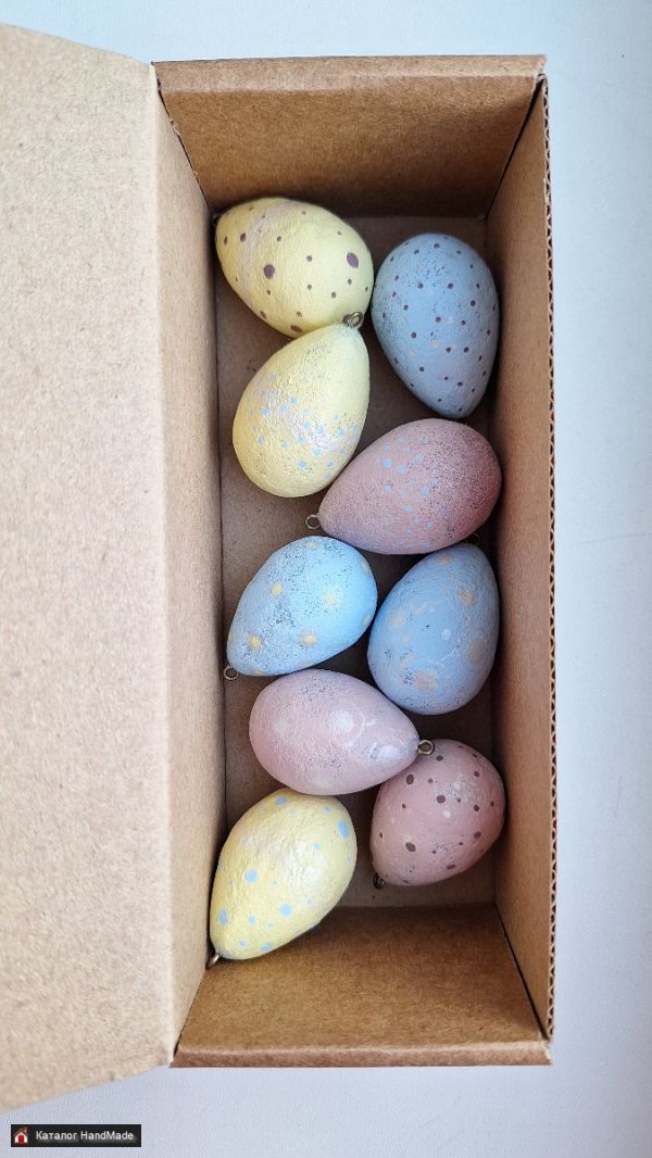 Пасхальный набор выполнен в технике папье маше. 100% ручная работа. Размер каждого около 3.5 см. В наборе 9 яиц, бережно упакованых в коробочку.