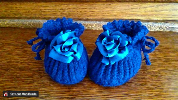 Пинетки для девочки связаны из полушерстяной пряжи. Длина стопы 10см. Декорированы розой из атласной ленты. Для фиксации на ножке протянут шнур из этой же пряжи, завязывающийся на внешней стороне пинетки. Цвет темнее, чем на фото.