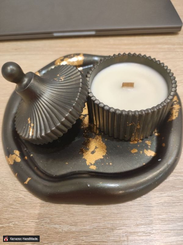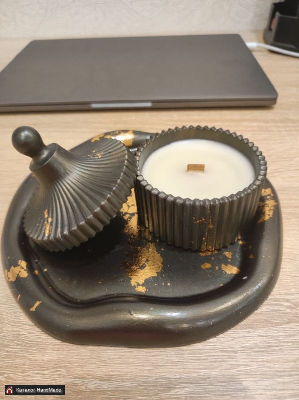 Поднос гипсовый и аромасвеча в гипсовом кашпо