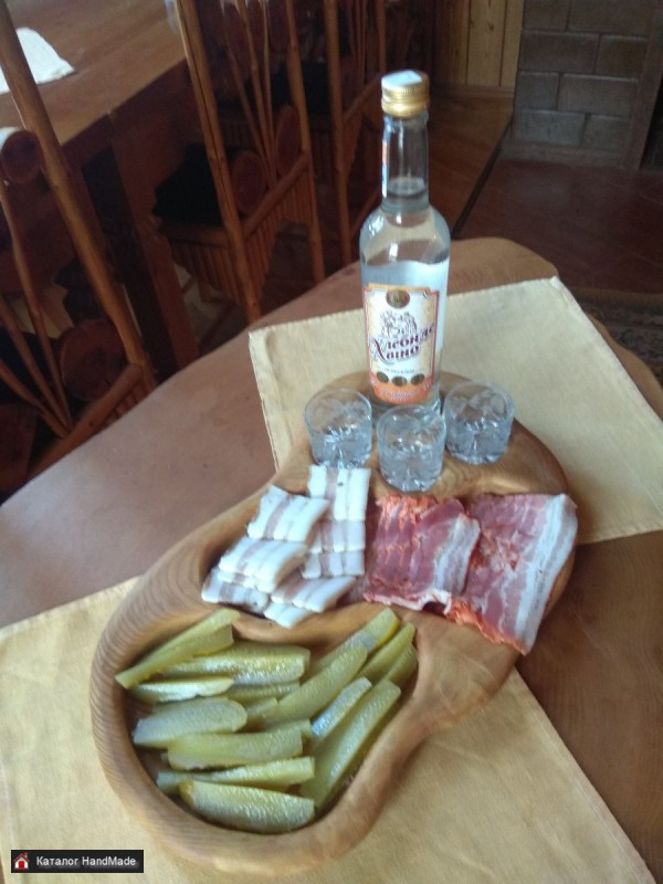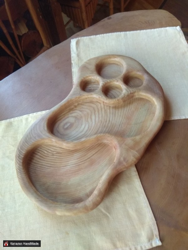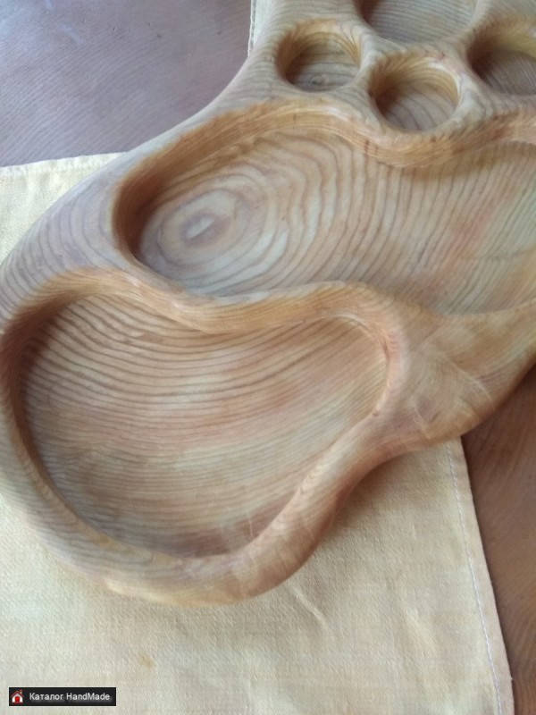 Поднос выполнен из поперечного спила капа лиственницы сибирской толщиной 32 мм. Глубина выборки отделений - 18 мм. Поднос пропитан маслом "Belinka" для пищевых продуктов. Размеры: 43 х 23 см.