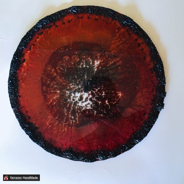 Роскошная подставка ручной работы из ювелирной эпоксидной смолы. Идеальный глянец, украшена крупным вулканическим песком по контуру Можно использовать как подставку на туалетный столик для парфюм а, косметики, бижутерии, свечи и т.д. Диаметр 30 см Не рекомендуется: 1. Избегать попадания прямых солнечных лучей 2. Использовать как разделочную доску 3. Мыть в посудомоечной машине 4. Не использовать порошковые чистящие средства, ни в коем случае не протирать ацетоном и спиртом Можно: 1. Подавать холодные закуски 2. Ставить горячую посуду 3. Использовать как декоративную подставку под украшения, парфюмерию и косметику 4. Мыть только вручную Возможна отправка в любую точку
