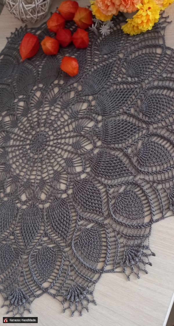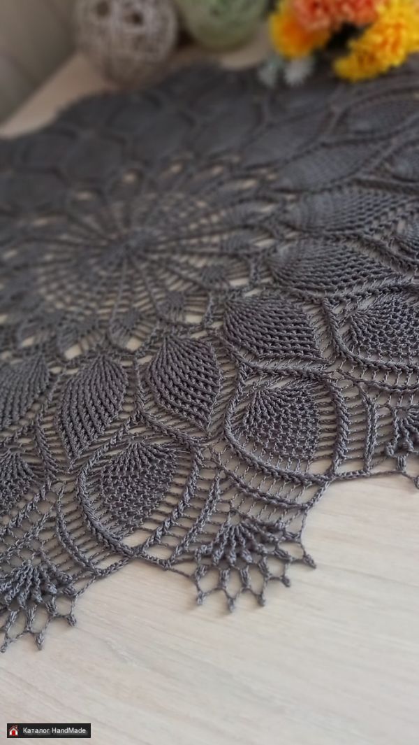 Большая рельефная салфетка круглая, диаметр 59 см. Связана из мерсеризованного хлопка. Цвет светлый маренго. Немного подкрахмалена.
