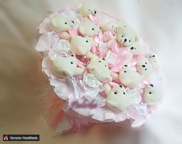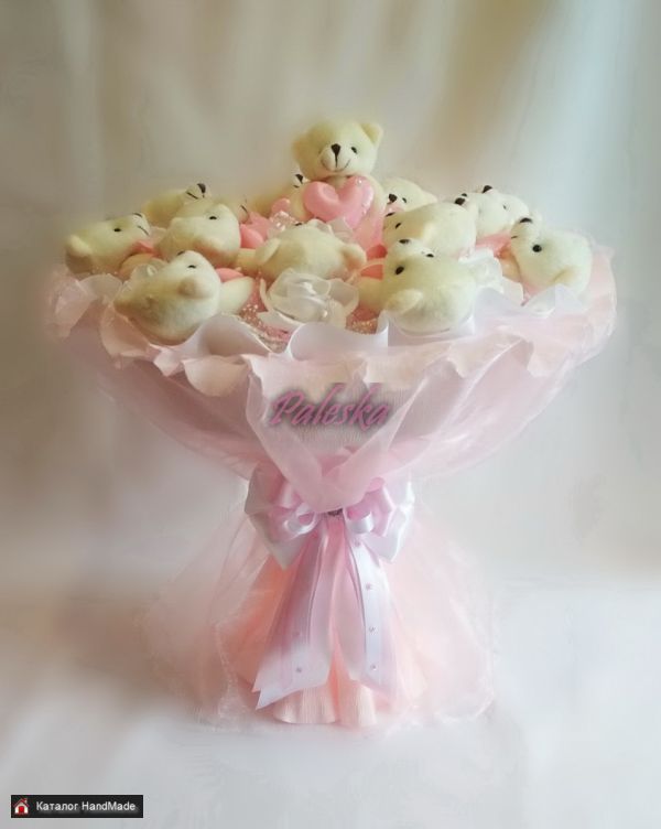Букет из мягких игрушек (мишек), розовый, Р1511 ― оригинальный подарок на выписку из роддома, выпускной в школу, 8 марта, день рождения, День свадьбы. Каждый букет ― это ручная работа мастерицы, что делает его уникальным и неповторимым. Кроме того, букет из мягких игрушек не завянет и не утратит своей привлекательности. Порадуйте своих близких оригинальным подарком наполненным теплотой рук мастерицы.