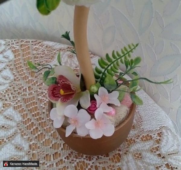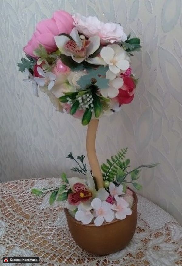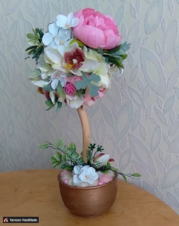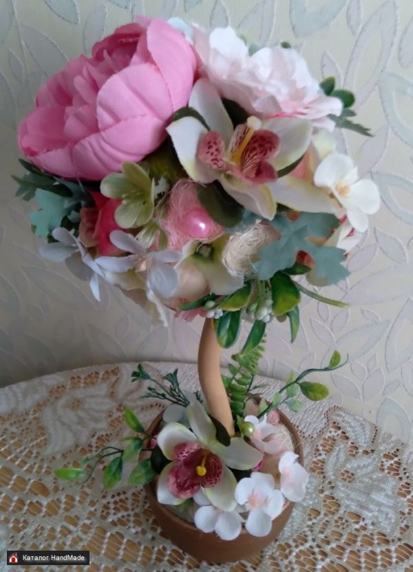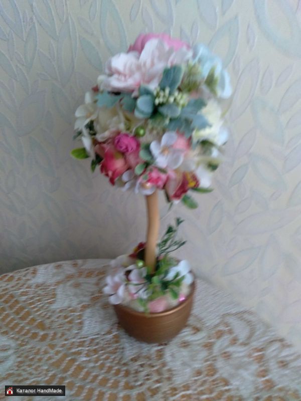 Размеры: высота 42 см; ширина кроны 18 см Используемые материалы: декоративные тканевые цветы, искусственная зелень, сизаль, бусины, декор, корелис, керамический горшок, гипс