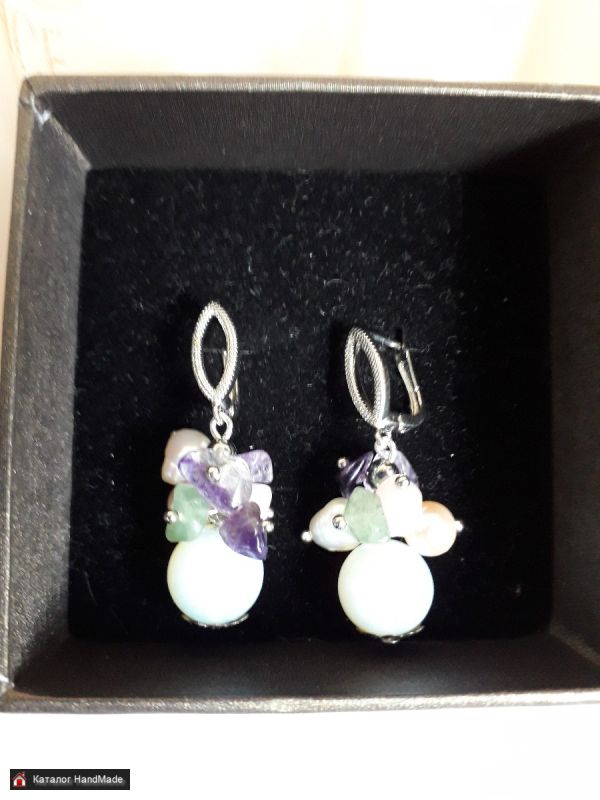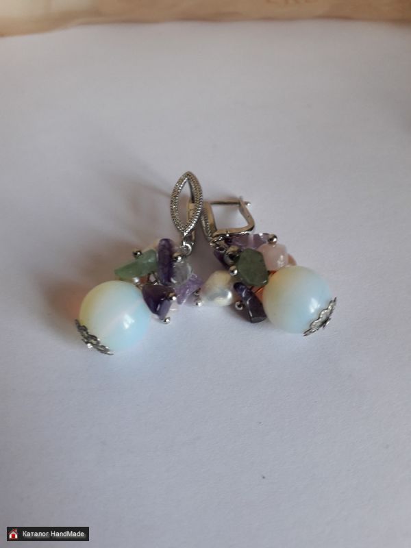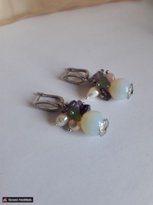Серьги с лунным камнем, жемчугом натуральным, аметистом, розовым кварцем, флюоритом.