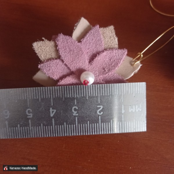 Серьги двухсторонние выполнены из натуральной кожи нюдовых оттенков (розовый,светлый беж), дополнены бусинами (имитация жемчуга) и бисером красного цвета.Качественные металлические швензы золотого цвета,застегиваются.