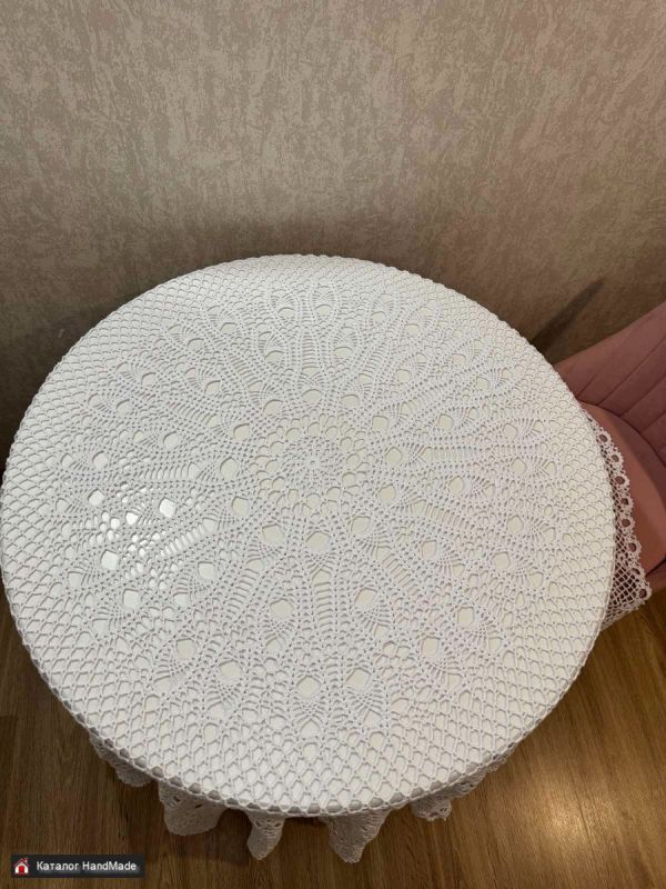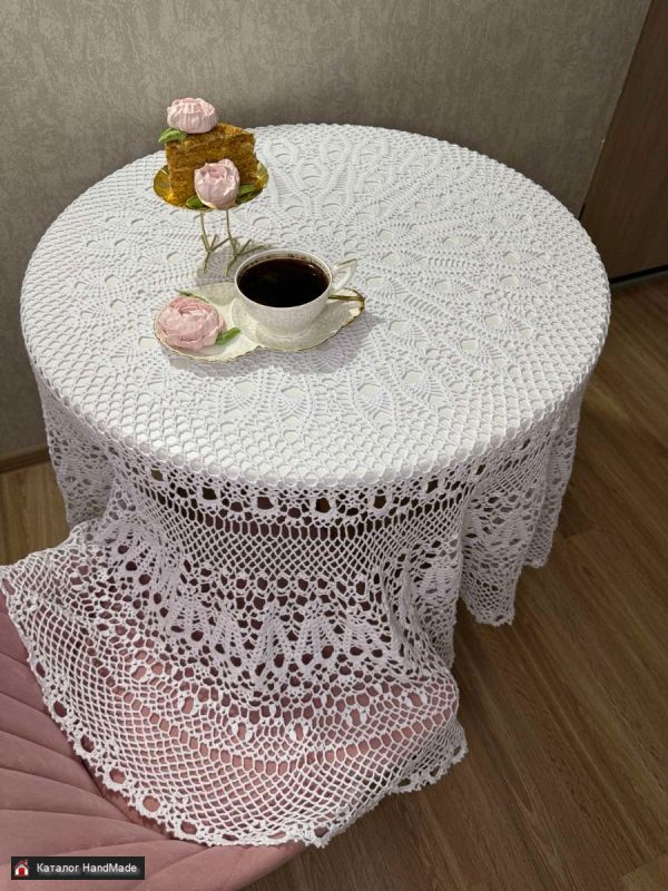 Изысканная скатерть ручной работы, подойдет ,как на каждый день так и для праздничного украшения стола. Легка в уходе. Цвет белый, размер в диаметре 180 см. можно использовать ,как накрахмаленную, так просто отутюженную.
