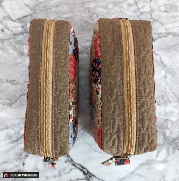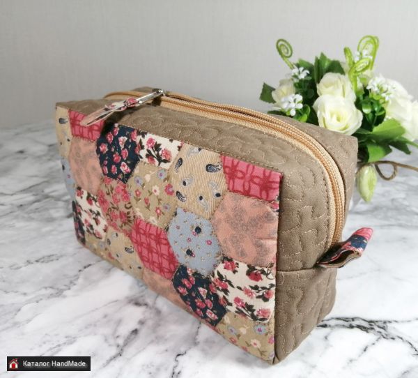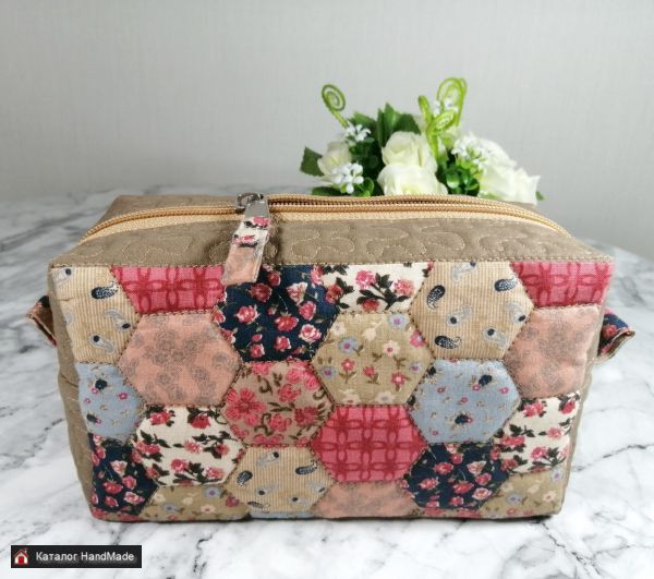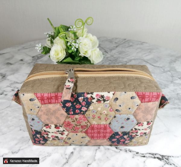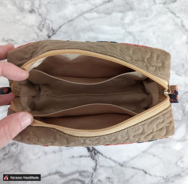 Косметичка простегана на поролоне, мягкая, прочная, хорошо держит форму. Подкладка из молочного сатина с двумя карманами. Можно стирать в стиральной машине.