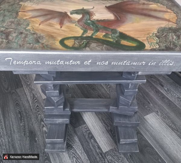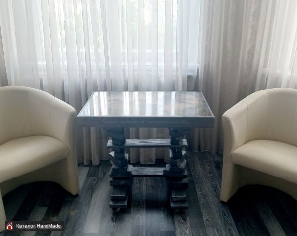 Стол выполнен в технике барельеф и покрыт эпоксидной смолой. По периметру расположена светодиодная подсветка. Подстолье изготовлено из дерева. Авторская работа.