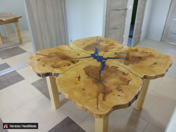 Стол состоит из четырех поперечных срезов клёна,каждый срез диаметром 70см.Середина залита эпоксидкой."Юбка" стола дуб,ножки сосна,основа под столешницу фанера.Высота 750мм, диаметр ~1250мм,толщина столешницы 40мм. Вместимость 8-10человек.Идеально подходит для большой кухни или зала.Стоимость договорная