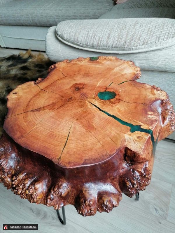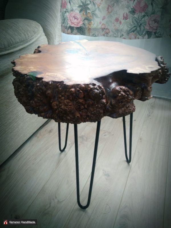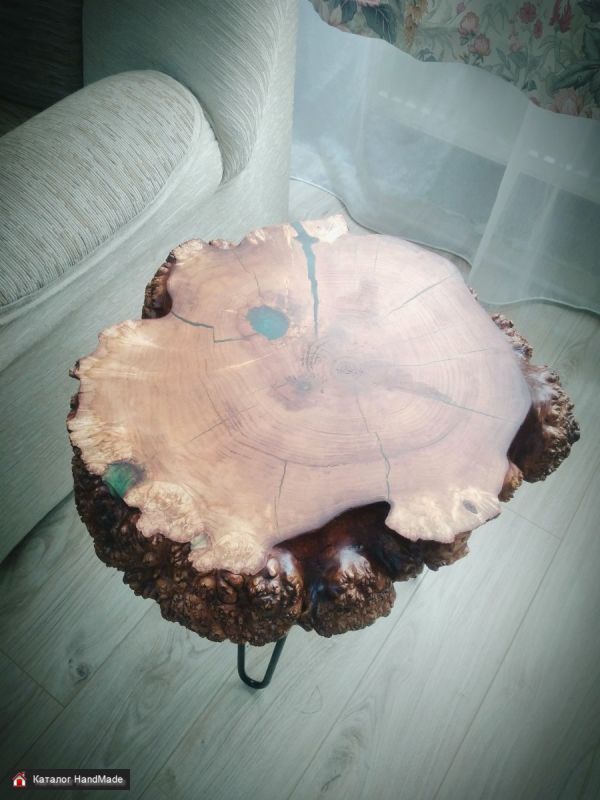 Столик кофейный,приставной из спила капового клёна. Трещины залиты эпоксидной смолой. Покрыт масло воск. Ножки шпильки.