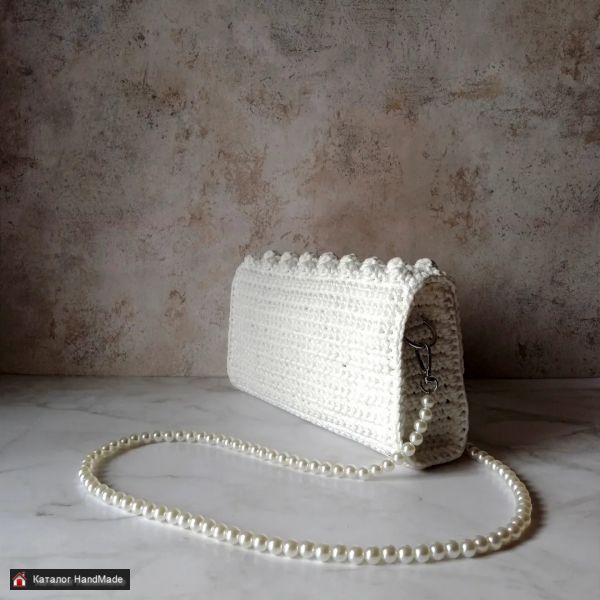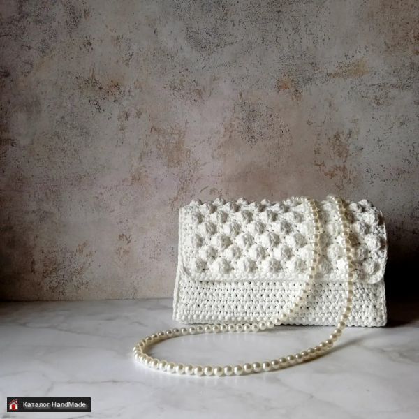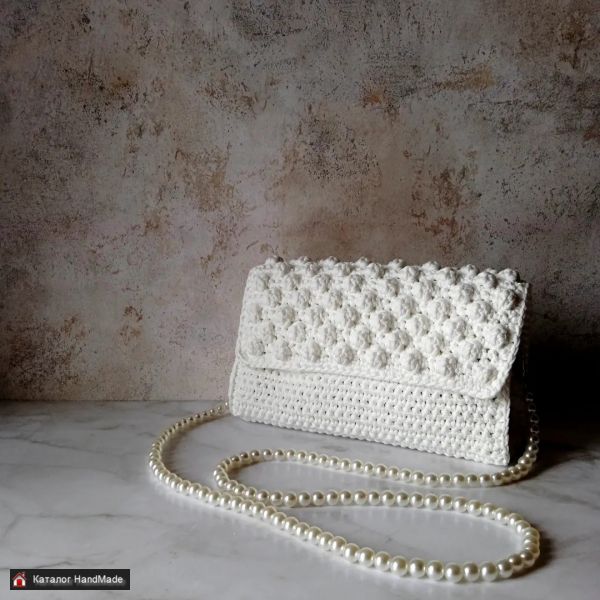 Вязаная крючком сумочка кросс-боди из полиэфирного шнура на магнитных кнопках с ремешком из жемчужных бусин. Размеры 27×17×7 см, ремешок 120см.