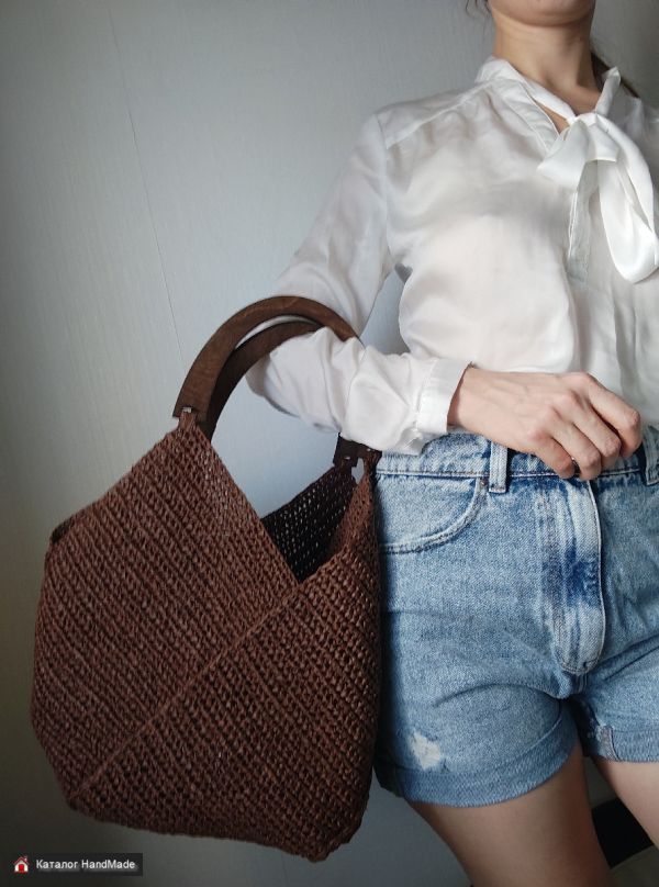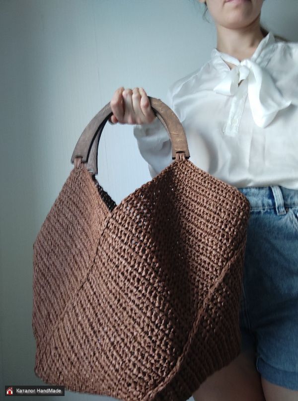 Летняя пляжная сумка коричневого цвета связана крючком из натуральной рафии. Женская сумочка имеет округлую форму, достаточно вместительная и легкая. В вязаной сумочке имеются деревянные ручки в цвет основного материала. Сумка из рафии без внутренней подкладки. Размеры аксессуара приблизительно 44см ширина и 30 см высота. Отлично подойдет в качестве подарка для подруги, мамы или родственницы на день рождения или 8 марта. Могу выполнить сумочку на заказ в другом цвете и размере, а также материале: рафии, трикотажной пряжи, полиэфирного шнура.