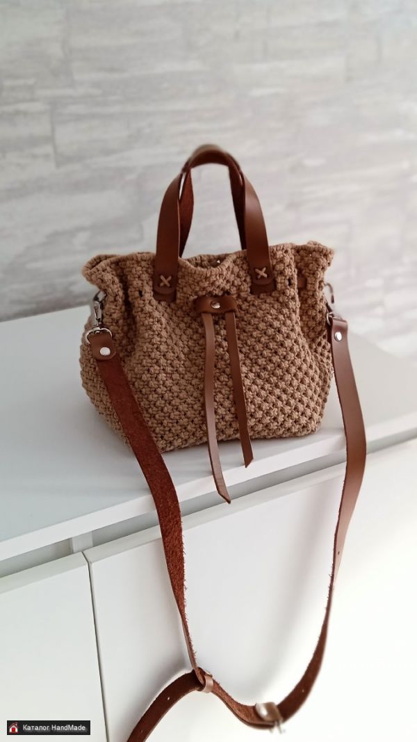 Сумка из хлопкового шнура, ручки, ремень и утяжка- натуральная кожа. Внутри подкладка с карманом . Застёжка на две магнитные кнопки плюс утяжка. Размер 30*15*18см. Ремень съёмный, регулируемый 120 см. Бережная стирка.