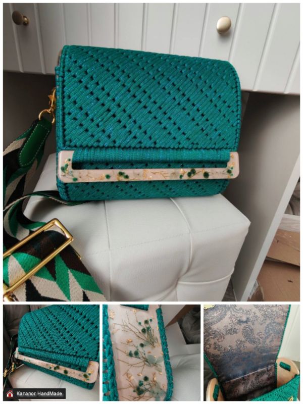 Сумка из шнура и эпоксидной смолы. Внутри подкладка с карманом. Цвет бирюза