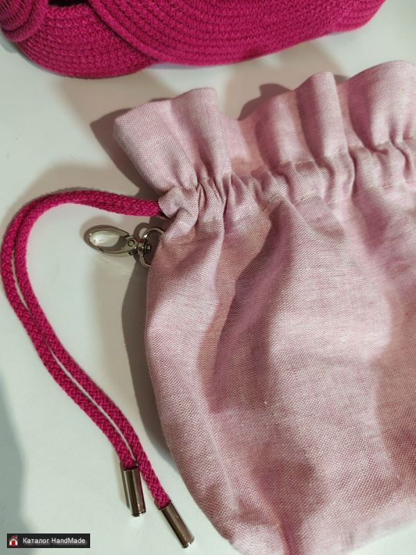 Прекрасная сумочка из хлопкового шнура для ваших не менее прекрасных образов. Внутри мешочек из натурального льна, пристегивается к сумке. В комплекте к этой сумочке их 2 - светло розовый и черный. Так же в комплекте идет длинный ремешок через плечо в цвет сумочки, он отстегивается. Возможно исполнение такой сумочки на заказ в любом цвете.