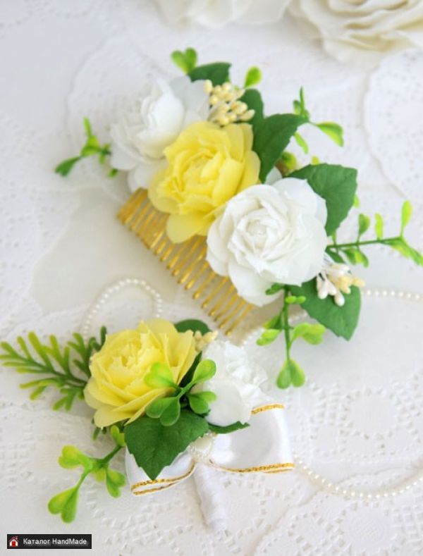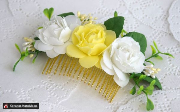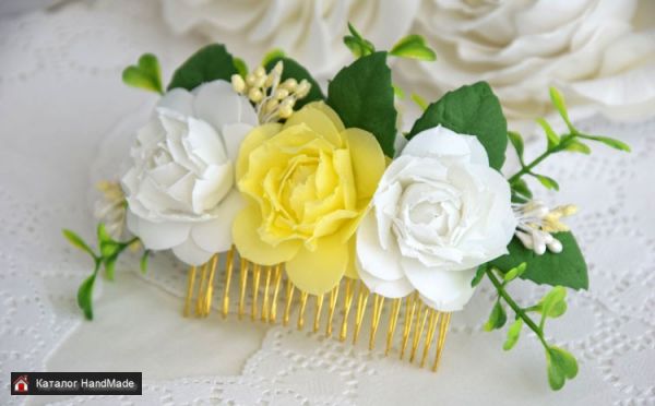 Гребень с цветами из фоамирана ручной работы. Цвета бело-желтые. Размер композиции 15 см. Основа металлический гребень.