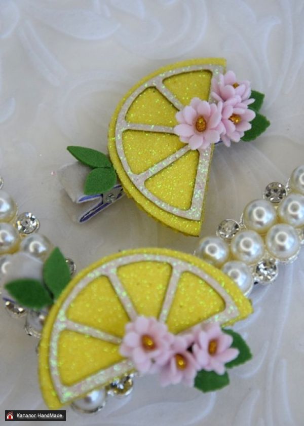 Парные заколки сердечки и лимонки с цветами из фоамирана и стразиками. Цвет ярко желтый. Цена указана за одну пару на выбор.