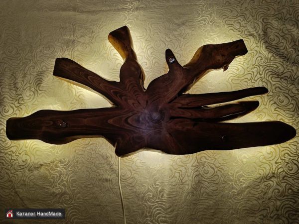 Уникальная лампа изготовлена из спила корня ели, что придаёт ей неповторимый природный рисунок и текстуру. Естественная красота дерева создаёт атмосферу уюта и гармонии. Каждый спил имеет свой собственный узор - аналогов не существует!!! Идеально впишется в интерьер в стиле лофт, скандинавский или эко. Качественная обработка и покрытие защищают дерево и сохраняют его естественную красоту. Добавьте в свой дом нотку природы. Освещение из шести светодиодных модулей, крепление к стене на дистанционных держателях (три сантиметра от стены), ширина 75 см, высота 35 см.