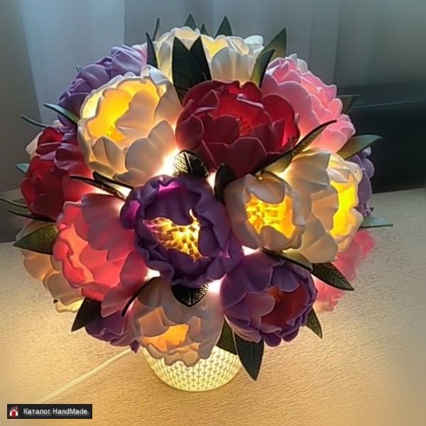 Светильник ручной работы Весенний букет, выполнен на основе заводского светильника шар, цветы из изолона. Работает от сети. Светодиодная лампочка в комплекте. Верх светильника можно открутить и поменять лампочку либо промыть цветы. Почтой или европочтой отправляю.