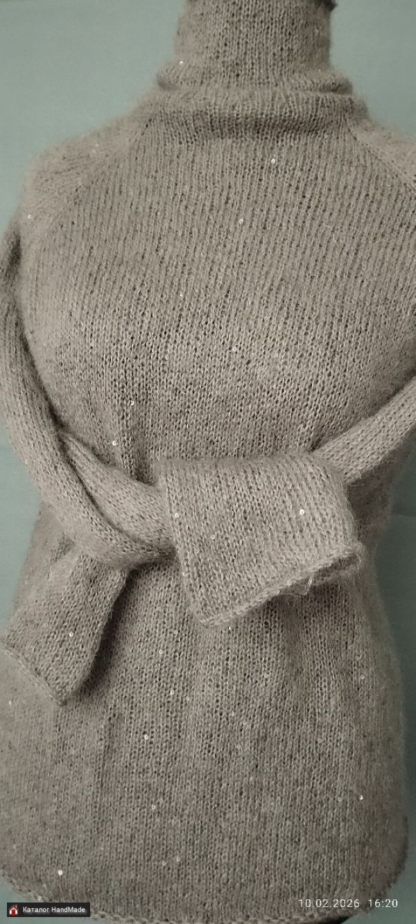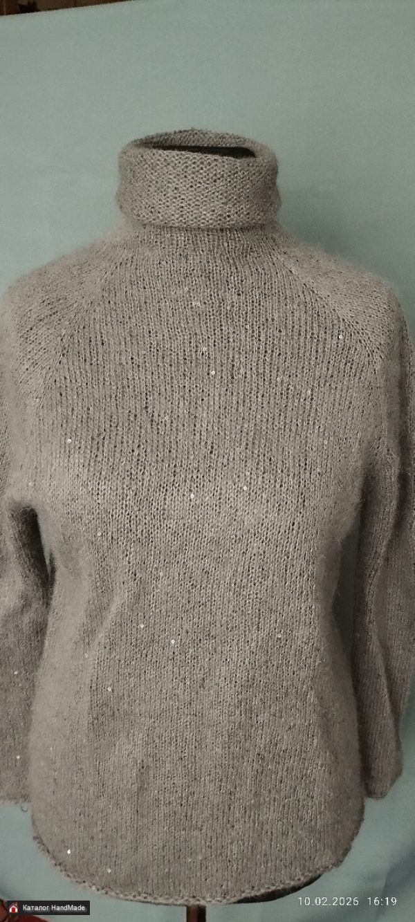 Свитер паутинка с прозрачной пайеткой. Связан вручную, без швов. Ворот высокий, несколько способов ношения. Цвет тауп. Мягкий,не колется. Размер L .