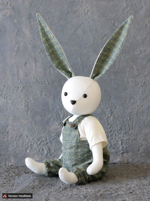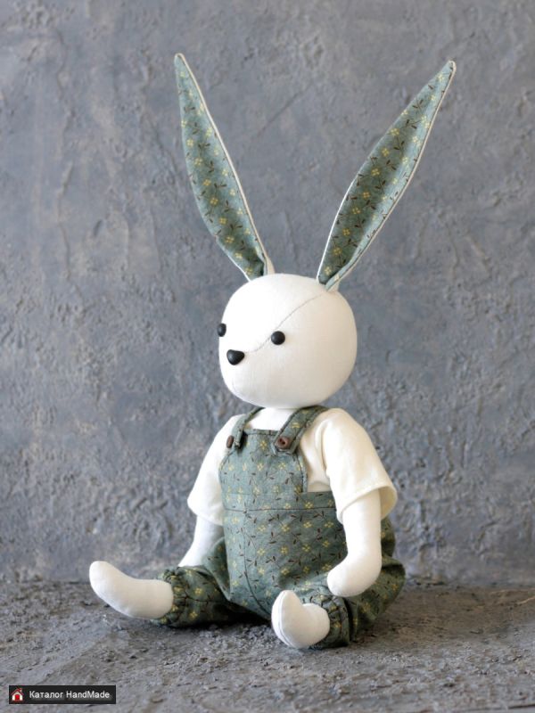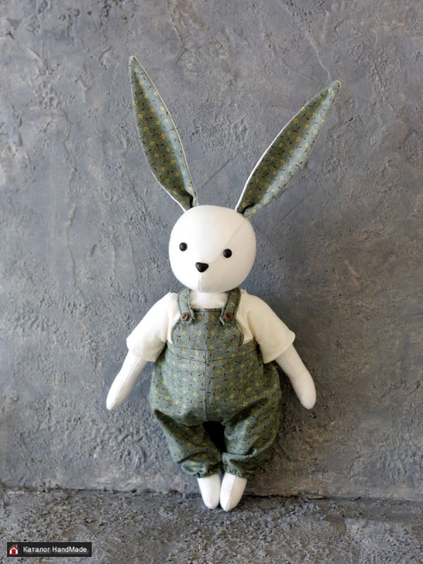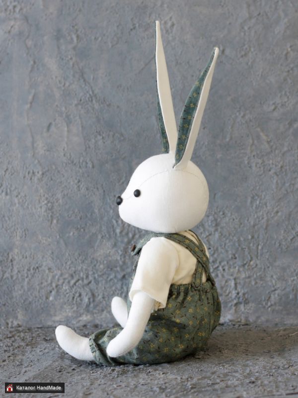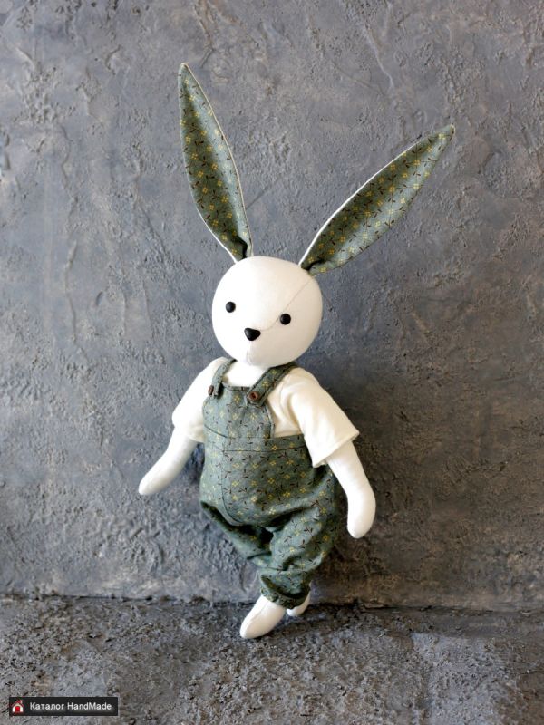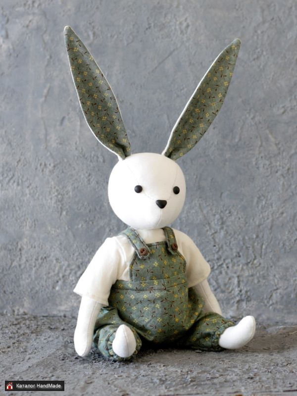 Зайка сшит из хлопка, гипоаллергенный наполнитель. Шплинтовое крепление лапок и головы. Высота 28 см без учета ушек. Глаза и носик из полимерной глины. Одежда съемная, также из хлопка. Подходит как для украшения интерьера, так и для детей. Можно играть, можно стирать.