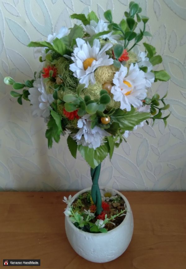 Поляна с цыплятами - оригинальное деревце напоминающее солнечный летний денек. А на полянке рядом резвятся милые цыплята. Высота деревца 38 см ширина кроны 19 см. Материалы: декоративные цветы и зелень, сизаль, бусины, декор, керамический горшочек, камешки, декоративные цыплята.