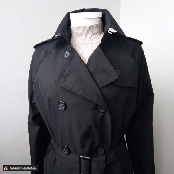 Тренч двубортный черный, ткань с водоотталкивающей пропиткой. Есть погоны, паты, кокетка на спинке, пояс на пряжке. Длина по спинке 115 см, пог 46. Размер оверсайз.