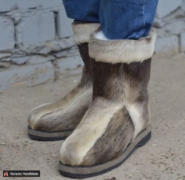 Мужские унты (бурки) из камуса лося, выполненные вручную. Подошва усилена войлоком и резиной. Внутри - натуральный овчиный мех, а пятка выполнена из кожи. Высота голенища составляет 25 см.