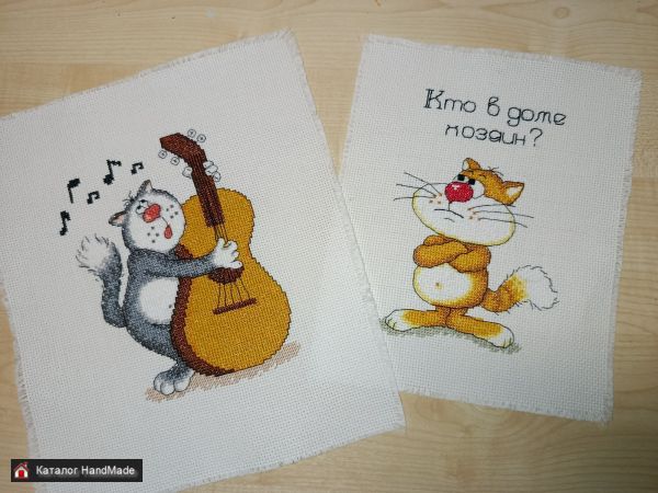 Вышивка без оформления. "Кто в доме хозяин?" Размер по краям вышивки 12х18 см. Канва 18х23 см. 50 руб. "Я Вам спою" Размер по краям вышивки 14х18 см. Канва 23х27 см. 60 руб.
