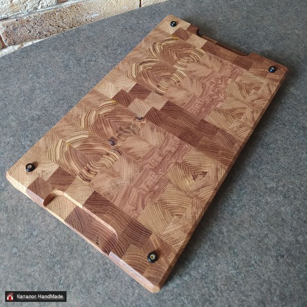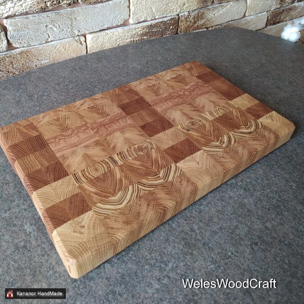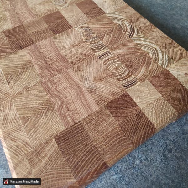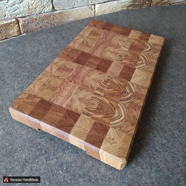 Яркая, контрастная торцевая разделочная доска. Создана из дуба, акации и ясеня. Покрыта минеральным маслом. Размер: 40х24х3.8см