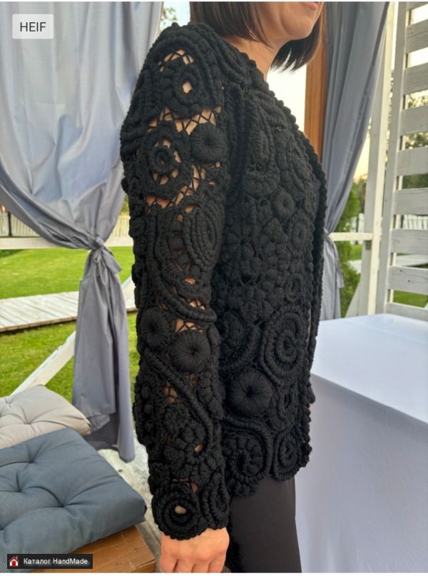 Женский жакет выполнен крючком в технике ирландского кружева,пряжа полушерсть.