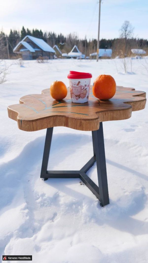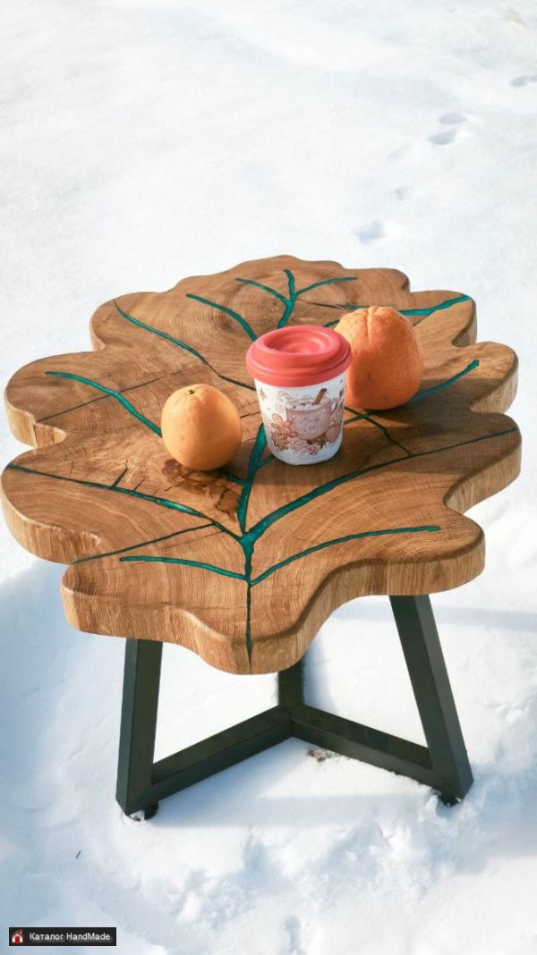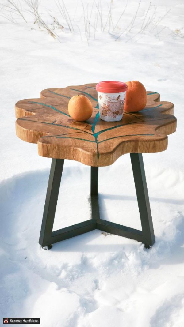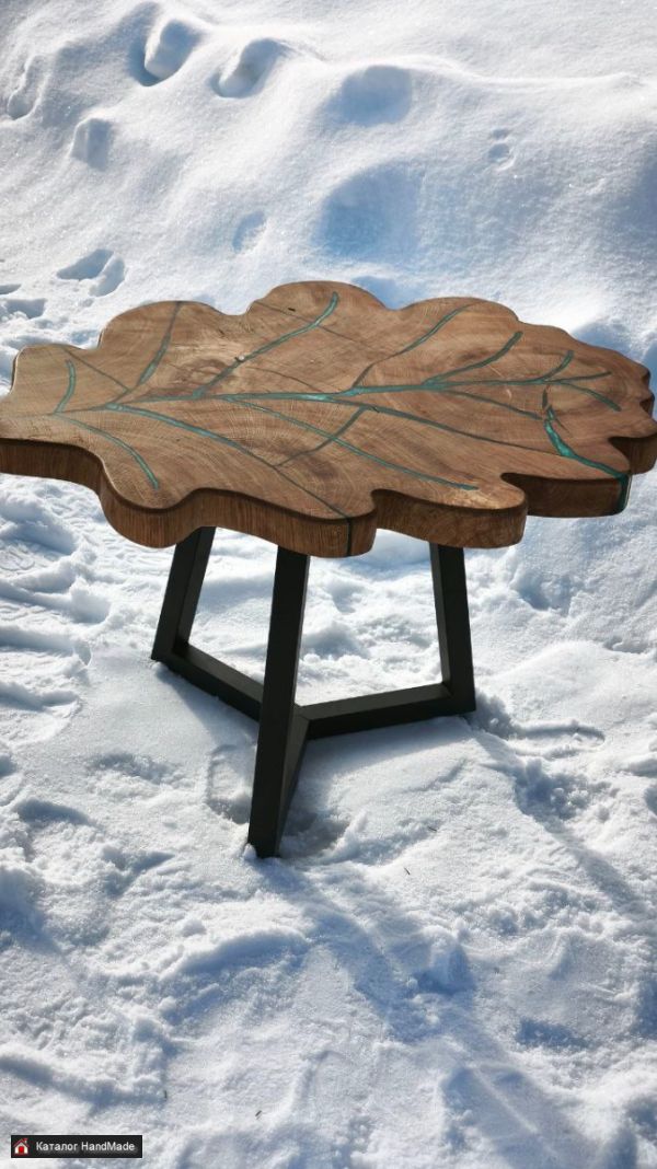 Журнальный столик из массива дуба в форме листа Живой рисунок дерева и заливка смолой подчёркивают природную текстуру. Такой столик не просто дополняет интерьер,а становится его акцентом и создаёт ощущение уюта.
