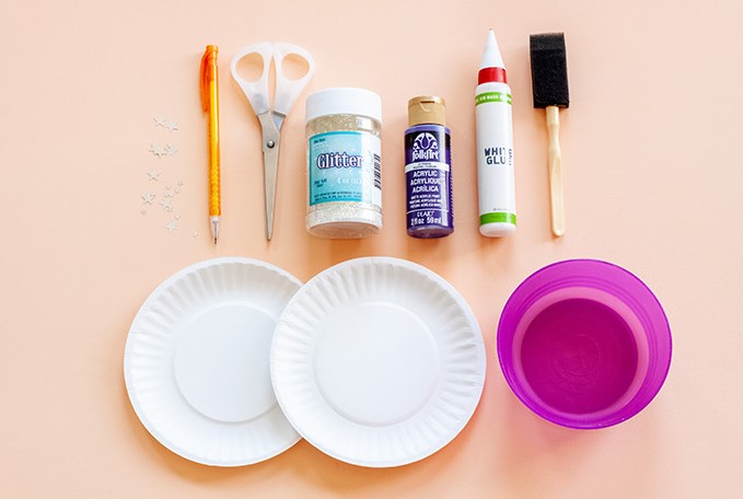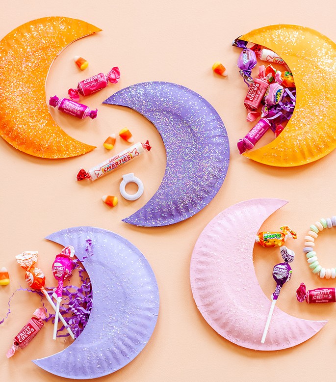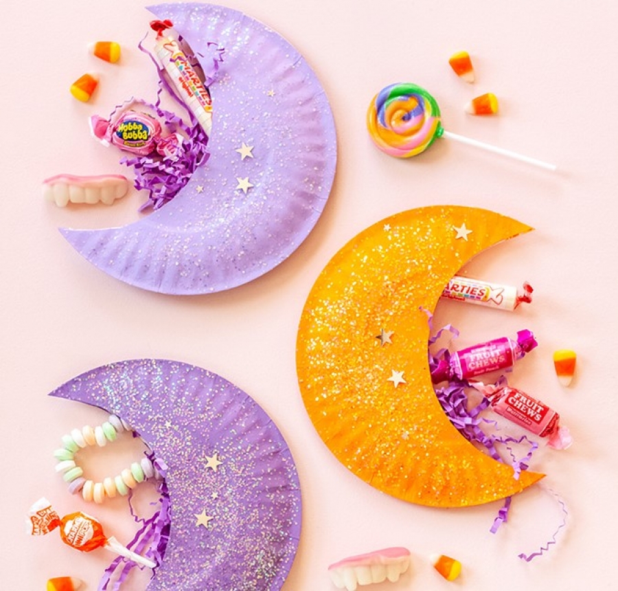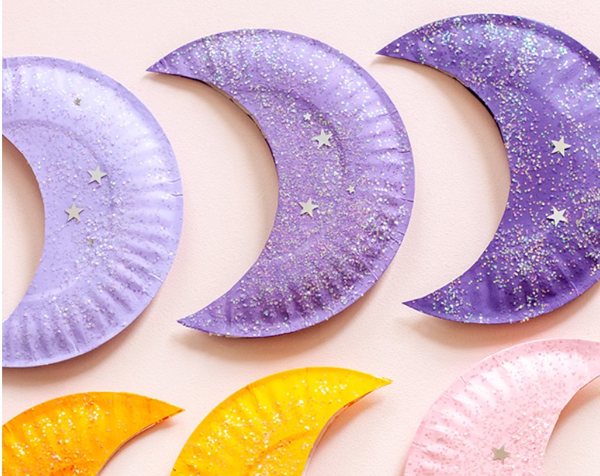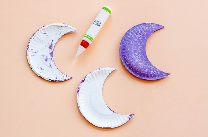 Поместите лунные тарелки в "чашеобразное" положение и нанесите линию клея вокруг волнистых краев одной луны. Срезанную сторону оставьте без клея. Выровняйте вторую тарелку по линии первой поверх клея и прижмите тарелки друг к другу по краям. При желании на луну можно приклеить немного звездного конфетти. Дайте высохнуть.