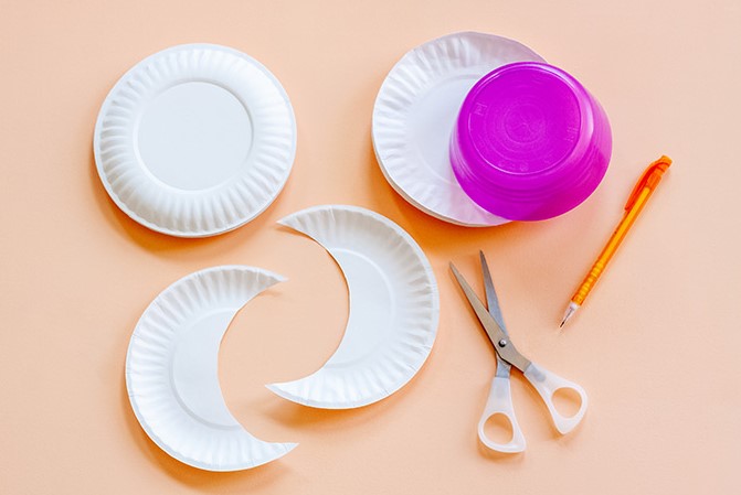 Переверните одну бумажную тарелку и положите ее на другую, создав между ними зазор. Теперь прижмите верхнюю тарелку к другой, чтобы она оказалась вывернутой наизнанку. Положите часть миски на тарелки, создавая форму луны, и обведите миску. С помощью маленьких ножниц вырежьте луну, держа две тарелки вместе все время. Если вы делаете больше одной луны, вы можете использовать тарелки в качестве трассировщиков.