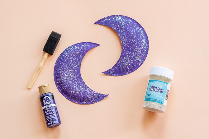 Переверните вывернутую наизнанку пластину в исходное положение и покрасьте две лунные пластины в выбранный вами цвет акриловой краской. Добавьте блестки на стороны, которые будут обращены наружу, пока краска еще влажная, и стряхните излишки. Дайте высохнуть.