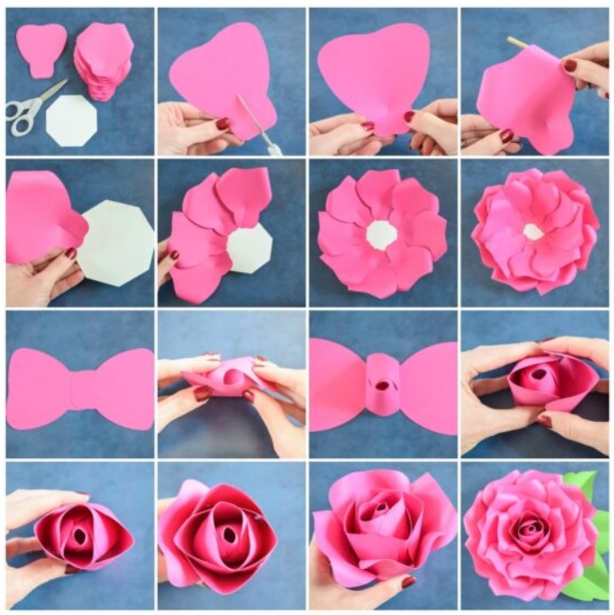 Этот способ подойдет, если вы хотите сделать большой цветочек. Вам понадобится основа из плотной бумаги в виде шестиугольника. Из розовой бумаги вырежьте прямоугольники и придайте им нужную форму. У каждого лепестка снизу сделайте надрез, чтобы лепесточек получался более объемным при склеивании. Бутон соберите так, как показано на фото. Останется только все теперь соединить вместе.