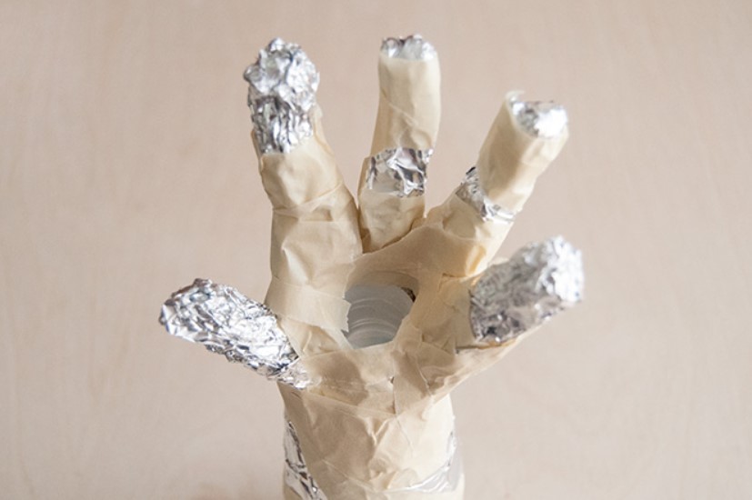 Придайте фольге форму пальцев и приклейте ее к верхней части бутылки. Добавляйте фольгу по мере необходимости, пока не будете довольны формой.