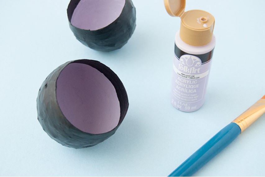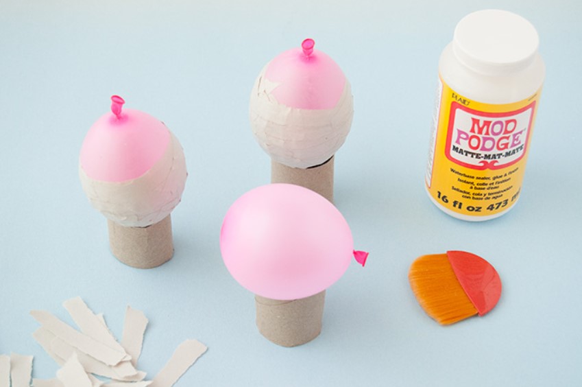 Надуйте шары с водой и установите их на небольшие миски (или нарезанные рулоны бумажных полотенец, как показано здесь). Нанесите слой Mod Podge на шар, положите небольшую полоску газетной бумаги, а затем еще один слой Mod Podge. Продолжайте этот процесс, слегка накладывая каждый кусок, пока нижние две трети шара не будут покрыты. Дайте высохнуть на ощупь и повторите еще два слоя, снова давая высохнуть.