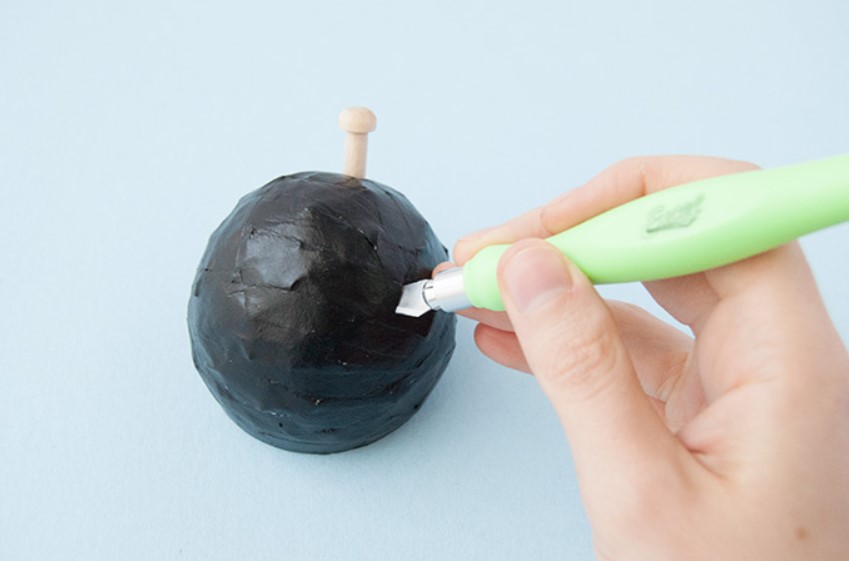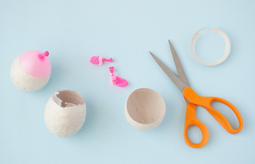 Когда бумажное маше полностью высохнет, с помощью ножниц надуйте и удалите шарик. Затем обрежьте верхний край, чтобы сделать его ровным и придать ему тот размер и форму, которые вы хотели бы для своих котелков.